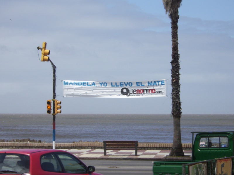 Y al par de días me vuelvo a reír con otro letrero. Uruguay acaba de clasificar al Mundial de Futbol de Sudáfrica y en la playa de Pocitos al día siguiente del triunfo que por fin se celebró con ganas, un lienzo dice: “MANDELA, YO LLEVO EL MATE!”…. Jajajajaja… No hacen falta comentarios.