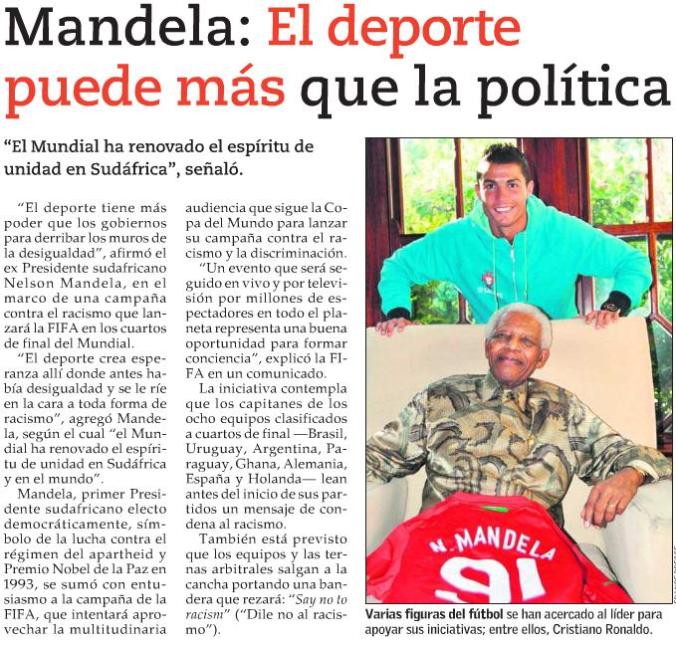 En medio de todo, el admirable y sublime Nelson Mandela abre éste, el mayor evento de su sufrido pueblo, con un sentido duelo por su bisnieta fallecida en un accidente de auto al regreso del concierto inaugural del Mundial. Entonces, vuelve a conmovernos, a conectarnos con el dolor, pues no asiste a la gran apertura de esto que él logró y luego llora en el funeral de la pequeña. Días después futbolistas famosos quieren fotografiarse con este Nobel de la Paz, él acepta sonriente y declara con fuerza que el deporte ha logrado derribar las barreras de la desigualdad que los gobiernos no han podido botar y que «el Mundial ha renovado el espíritu de unidad en Sudáfrica y en el mundo». Y sí, Sudáfrica y su continente están de fiesta. Varios países hemos tenido la nuestra a raíz del fútbol. Y muchos hemos vibrado al ver la alegría cándida del país anfitrión.