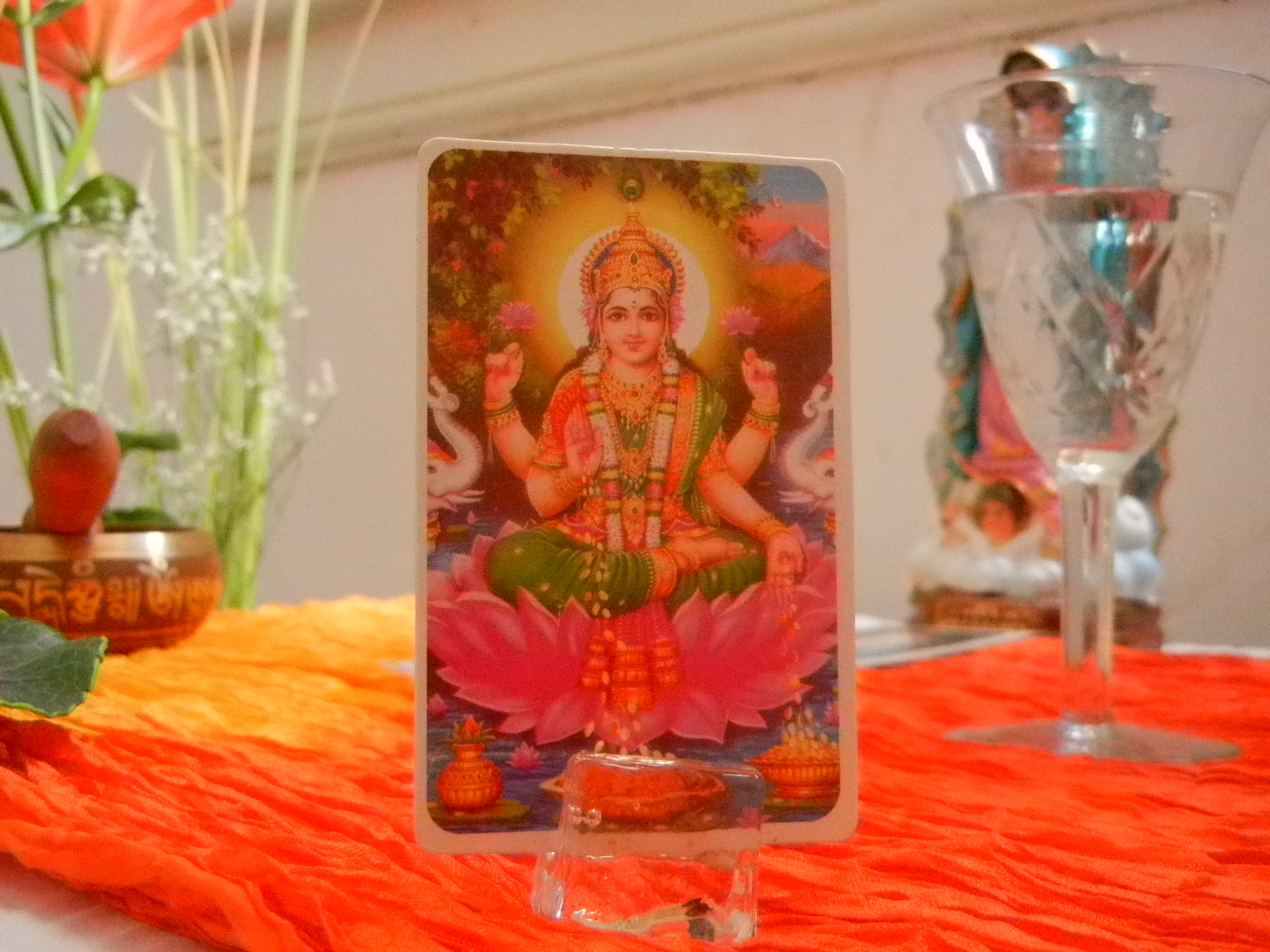 Con Lakshmi siempre tuvimos buena onda, amor a primera vista, mejores amigas. Por eso está en otro cuadro en la entrada de casa con un altar exclusivo para ella y en tonos turquesa, con su arroz, joyas, dulces, monedas, flores; ocupa también un rincón de mi consulta en Santiago; la he regalado muchas veces enmarcada y ahora está a cargo de las llaves de mi maleta, mientras que el calendario regalado desde 2006 está en mi billetera, aunque a veces se pasea por mi escritorio y otras veces se posa en mi altar. Lo mismo hace hoy, en que la meditación de la Esquina de Luz de Su, que se realiza en su casa cada noche de miércoles, honra al Arcángel Uriel con su luz oro rubí y a él lo acompaña nada menos que «mi» Lakshmi, a la izquierda del altar, actualmente comandado por Lupita (igual que este blog).