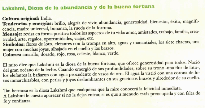 Años después, otra canalizadora me habló de un par de vidas en India y cuando me relataba las imágenes fue como teletransportarme a ese espacio-tiempo, y podía sentir la escena, con el dolor que ella describía, en este caso, y me dio más de una respuesta a temas de esta vida…. Y hace varios años en ciertas tiendas indias en Santiago buscaba imágenes de Lakshmi y no tenían; el dueño de una me regaló un calendario de bolsillo una vez, después de verme escarbar en unos canastos hasta encontrar un par de llaveros, y otros vendedores me regalaron un poster que decoraba la caja de la tienda porque no tenían nada más y yo pregunté si me vendían esa imagen, la cual hasta ahora está en la puerta de mi cocina, a la entrada de casa. Ahora ella, la diosa de la buena suerte, abundancia y belleza, está en muchas tiendas, en fotos, lienzos, cuadros, etc. Mi amiga-maestra Silvia Selowsky dice esto (y más) en su libro El Oráculo de las diosas:
