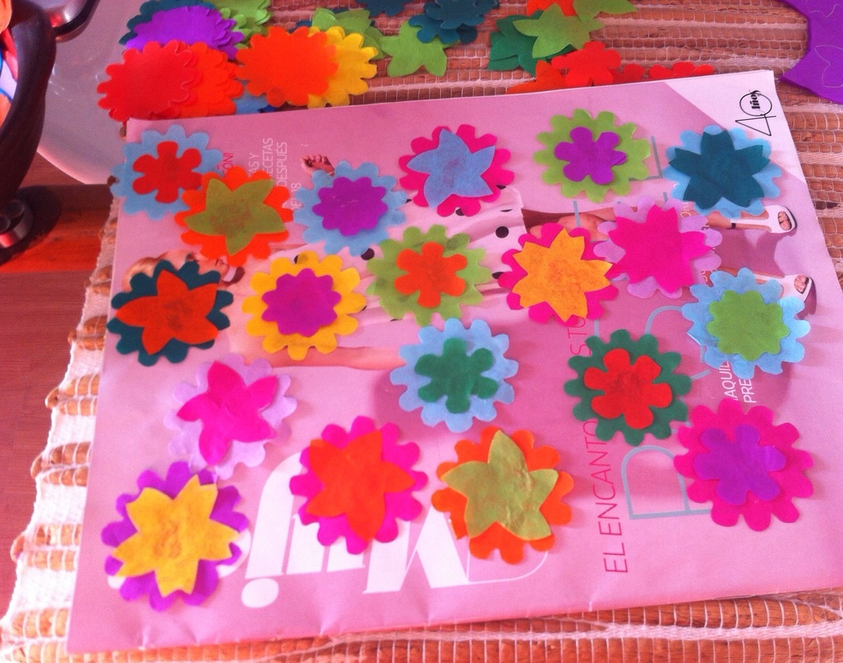 La semana pasada, después de ir a un festival de danzas circulares, en que la vecina Lily me avisa pero yo tengo otros compromisos por la mañana y de tarde ella, que sabe que amo la música y el baile, me insiste en que vaya porque me dice que está muy lindo, agarro un taxi y parto por la tarde en un sábado de nubes oscuras. Allá me encuentro con gente conocida además de Lily, la música me confirma lo que yo venía sintiendo para el ritual y lo que he vivido este invierno: conexión con nuestra tierra, la sanación del sur y la alegría más libre del norte. El salón está decorado con grullas de origami, que se ven muy bellas con la luz cayéndoles al centro del círculo… De vuelta regresamos un tramo caminando y Lily me ofrece algo: «Jime, si necesitas algo para el ritual, algo manual, yo estoy disponible, puedo hacer de estas grullas, demás que aprendo o lo que necesites, en serio» -le agradezco mucho y yo, que estaba sintiendo lo del florecer, al día siguiente le digo: Veci, te cobraré la palabra, de tus manualidades para el ritual, podrás? -Y ella, que es aplicada en seguida se pone practicar lo de las grullas, que desde la primera le queda bacán. Cada uno con sus dones, ¿verdad? Y le digo, jaja, pero yo tengo otra idea: necesito flores, porque vamos a florecer, entonces ¿puedo pasarte los papeles y los moldes? Y dice: Sí, Jime, yo las hago no te preocupes; y hasta me manda fotos de los avances de su ofrenda para este ritual… Le agradezco infinitamente y compruebo cómo se provoca una cadena de amor cuando nos atrevemos a pedir ayuda… Las flores de Lily