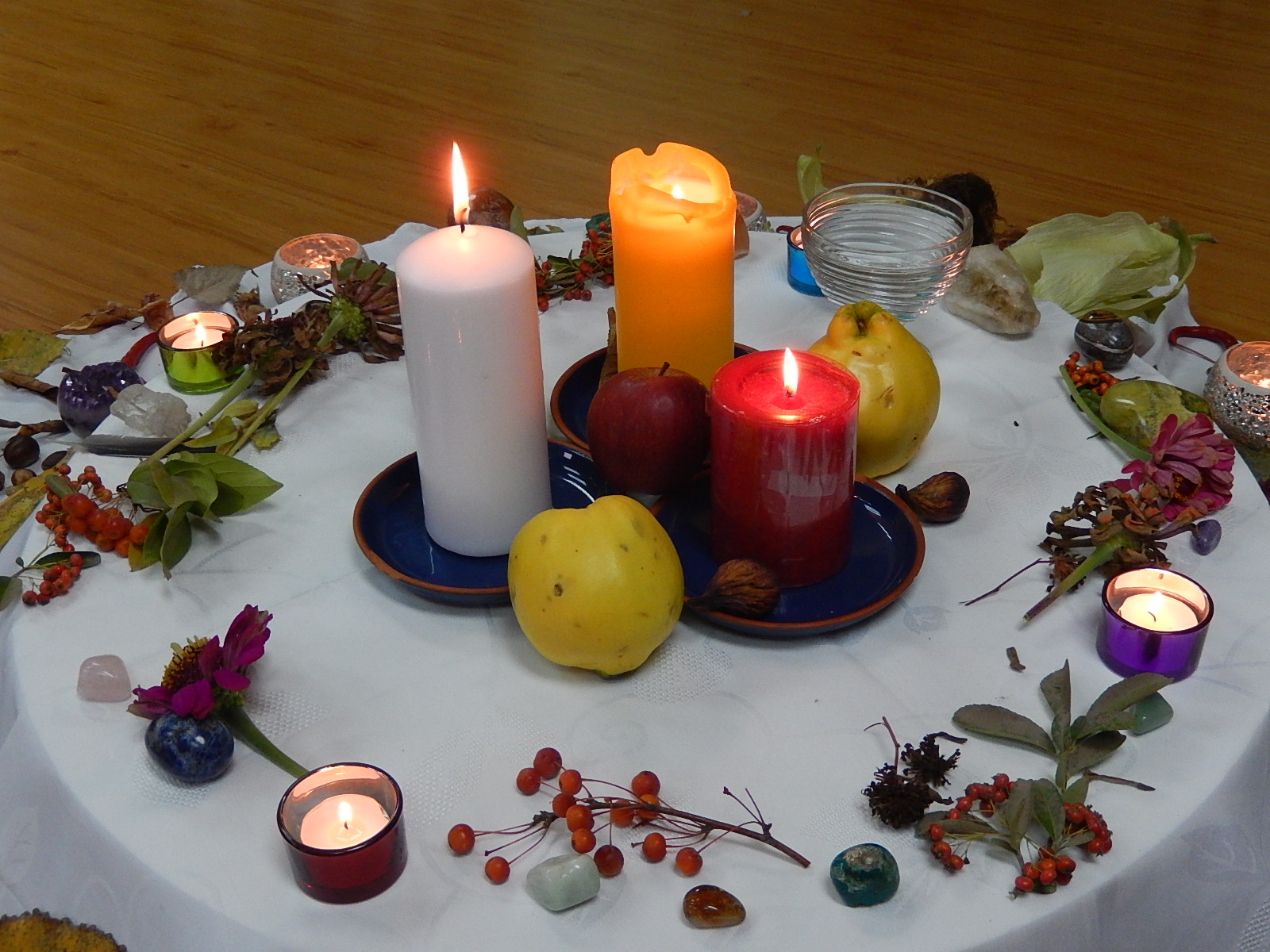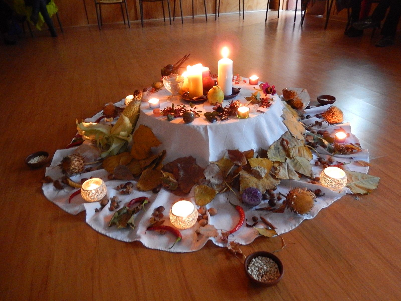 Así, nuestro altar tiene frutos de esta tierra: castañas, nueces, avellanas, higos, membrillos –que por la mañana trajo de regalo Domingo, quien arregla el techo y el jardín de Doris y en silencio los deja sobre la mesa de la terraza-, manzanas, choclos, ajíes; flores secas y frescas, pequeños frutos rojos, semillas, cristales, velas, agua, pocillos de arcilla, porotos; hojas de parras, de álamos, liquidambar y otros del camino…