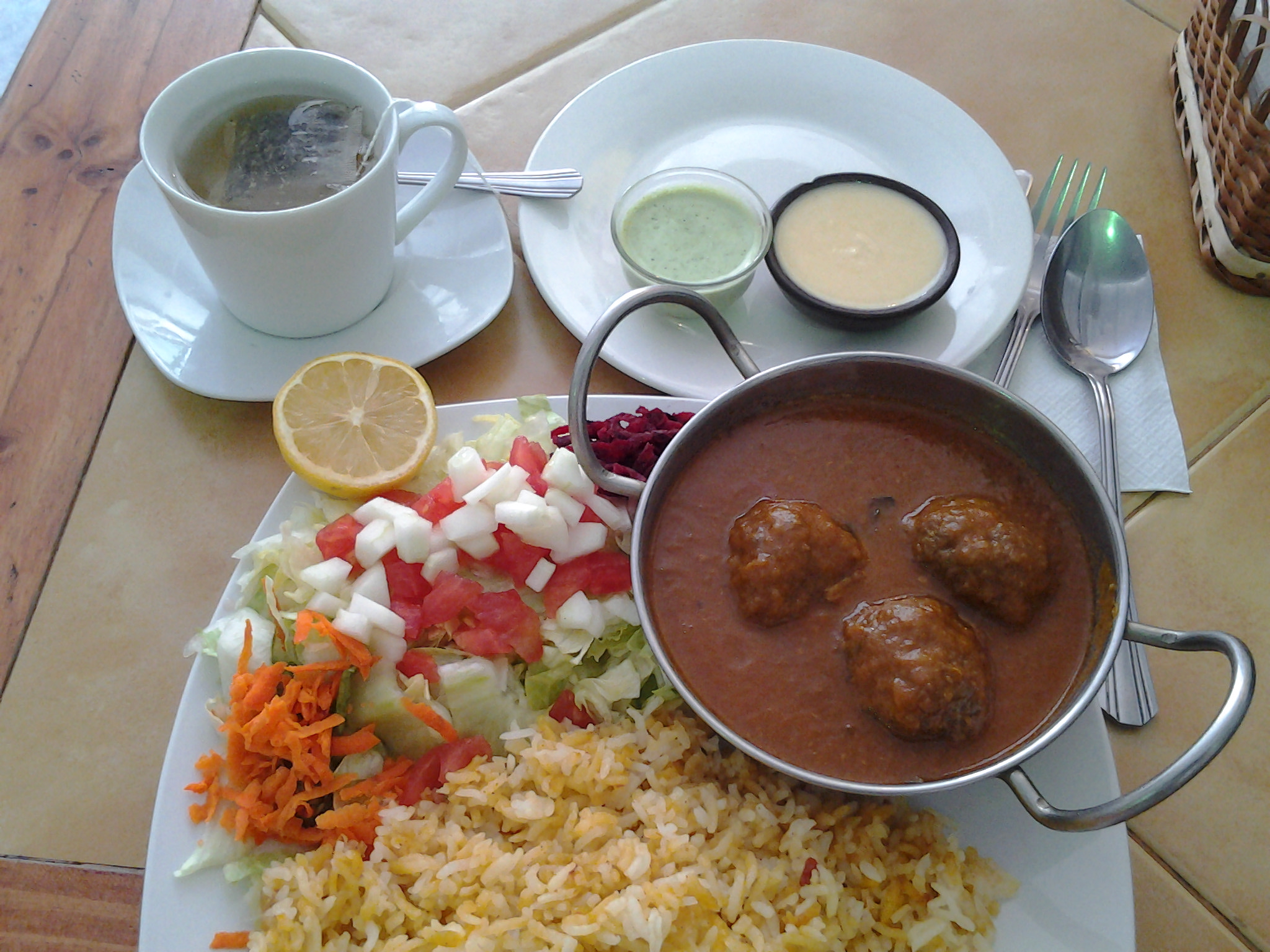 Bueno, para otro día será… Podría haber algún lugar por aquí -pienso- pero sé -era mi barrio de infancia y sigue siendo el de mis padres- que sólo hay pizzerías, hot-dogs y otras cosas… Me dispongo a cruzar la calle en el medio (por donde no se debe) y cuando miro en frente dice: EXQUISITOS SABORES DE PAKISTÁN, PARA SERVIR Y LLEVAR…. Guauuu! Casi salto hasta la otra vereda de pura felicidad y digo: es demasiado grande la Divinidad; Universo, eres muy bakán, gracias! Ángeles de la comida: gracias por favor concedido-. Entro curiosa y extasiada, es un lugar pequeño llamado «Karachi Spice», es lo que se conoce acá como «picada» (restaurant un tanto escondido, conocido por muchos de boca en boca pero sin publicidad; bueno, bonito y barato), son unas diez mesas con un poco de decoración pakistaní y una mesera chilena muy simpática que me muestra la carta donde están todos los sabores que tenía en mi paladar mental desde el martes y otros que desconozco pero que suenan tan bien… Me cuenta detalles del lugar, el único de comida pakistaní en Santiago… Vaya honor el mío!