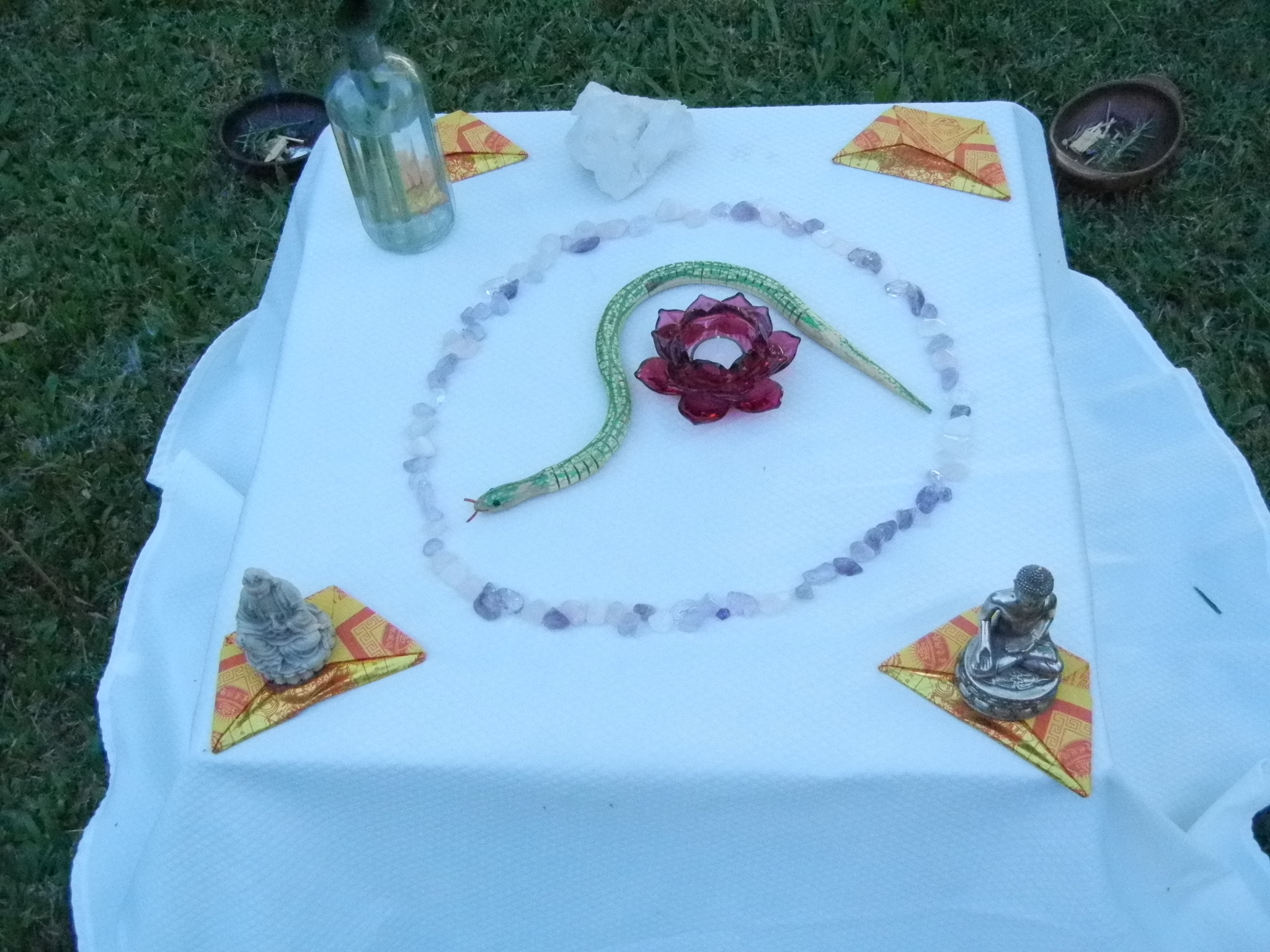 Al día siguiente, las flores, los llamados, las conversaciones, los detalles; pasa Fer a casa para ir llevando las cosas temprano… Comienza, así, a formarse un bello círculo de luz que da vida al Ritual de la Serpiente de Agua 2013, un encuentro que, sin pensarlo mucho, se me ocurrió proponerle a Su a fines de enero, a lo cual ella saltó con un Sí rotundo y entonces debí acomodar agenda, maleta y detalles ritualísticos, además de cruzar un particular portal para llegar hasta acá (si no se enteró puede leerlo aquí) y, entonces, verme rodeada de gente bella que colabora con mucha entrega y alegría sin siquiera conocerme ni saber qué es un ritual. De hecho, después supe que acá la palabra «Ritual» suena un poco a brujería y que eso puede haber despertado la desconfianza de algunos, pero para mí Ritual es de la tierra, es festejo, es un paso… En fin, estamos todos aprendiendo.