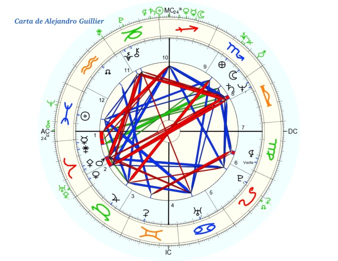 Si Alejandro Guillier (del 5 de marzo del ’53; tiene Sol y ascendente en Piscis, con Mercurio muy presente) viniera a mi consulta le diría que efectivamente es una de sus tareas y destinos la comunicación, que se realizaría bastante en la escritura –incluidos los guiones de suspenso-, en editoriales, en psicología, en los análisis de masas, en la asesoría a personajes públicos o en la diplomacia; que el rol de senador lo identifica mucho dado su Medio Cielo en Sagitario (interés y vocación ligadas a filosofías, política, legislación). Que es necesario que viaje y ojalá a solas un rato, pues requiere –cada tanto- encontrarse y retomar la inspiración a través de estar consigo mismo. Le hablaría del desapego que ya conoce de pequeño a través de experiencias drásticas y que le corresponde practicar como tarea del alma: más flexibilidad, soltar lo que no se da, aceptar y empezar de nuevo. También me detendría en cómo maneja la rabia (Marte incómodo y varios planetas en Aries), pues se le arranca, se vuelve hiriente y defendido pese a ser –secretamente- muy sensible y empático. Y no sólo eso, este candidato –con varios planetas en casas de agua- es muy intuitivo, pero tiene que aprender a creer más en este don, porque cuando le hace caso sólo a su mente se pierde y atrae a socios o situaciones muy demandantes. Además, su Júpiter (profesor) en tensión a Plutón (control) pueden volverlo dogmático. Por lo mismo le diría: ¿Haces deporte? Porque te hace bien drenar intensidad: botar rabia, miedos, hastío. Eso te revitaliza y te da más claridad en tus decisiones-. Para complementar esto agregaría que una de sus paradojas -todos las tenemos, ¿no?- es que él tiene bastante fuego (chispa, ímpetu) en su carta pero dada su Vesta unida a Quirón (el fuego interno está “herido”, dolido) puede no sentirlo tanto o los demás no verlo; él tiene un pendiente con la pasión; buscarla y encontrarla en alguna actividad e interés –no necesariamente profesional- le otorga poder personal y más sentido de vida, aunque puede que la crianza de los hijos ocupara -en su momento- mucho este espacio. Es que a Alejandro Guillier le gusta la intimidad, se ve muy reservado en torno a sus emociones, en especial a sus temores y dolores; resguarda a los suyos, podría volverse algo celoso y valora mucho a sus cercanos; pero quienes logran acceder a lo que de verdad siente no son muchos.