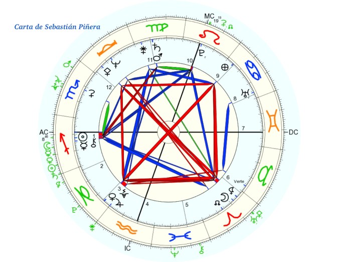 Si continúo con el ‘juego’, al tener a Sebastián Piñera (del 1 de diciembre del ’49) en lectura, no me detendría mucho en los deportes porque obviamente debe hacerlos y además los necesita, son parte de él; tampoco en la pasión porque la tiene en exceso con Júpiter, Venus y Vesta en conjunción, por tanto algunas de ellas son los viajes, aprender, enseñar, prosperar, ganar; necesita sentirse vivo. Le diría que habría sido un gran aviador y que, de haber conocido a la ‘señora’ Paciencia, podría haber sido el Steve Jobs chileno -podría, dije-. Con él profundizaría en dos temas muy evidentes en su carta: cómo se presenta ante los demás y en su sistema nervioso. Sobre esto último, seguro él ya sabe que tiene un síndrome de Tourette o algo similar (en varios años de astróloga, he tenido a unos tres consultantes con esta afección y todos poseen dos rasgos marcados dados por la energía acuariana: son muy inteligentes y obsesivos a la vez). Con un Urano (planeta de Acuario, electrizante, que vibra en originalidad, vanguardia, libertad) muy protagónico, la mente del ex Presidente es rapidísima, brillante, futurista y muy creativa; pero la conexión emocional falla y el cuerpo acusa este vacío mediante tics, lapsus y el descontrol de algunos movimientos. Por lo mismo, le diría que incorpore más música –uno de sus talentos no usados- tranquila, baños de tina o natación, junto con ir más lento, aunque probablemente esto sería mucho pedirle; pues no es para nada su naturaleza. ¿Sobre el primer tema? Con Sol (brillar), Mercurio (mente y habla) y Quirón (rechazos y carisma) en el ascendente, él se nota, llena el espacio, lidera innatamente, viene a entusiasmar al resto; pero no mide ni su fuerza ni el impacto que causa. Es demasiada energía que llega de forma ‘pesada’ a los demás; por tanto invade y presiona. Tiene que aprender a regularse, a observar y sentir el ambiente antes de actuar y de hablar; las palabras prudencia & mesura debiera tenerlas de protector de pantalla en su celular. Ahora, él no tiene esta intención, no se da cuenta de su efecto; seguro se hizo más consciente de esto con su paso por la Moneda porque lo de él no es el trabajo en equipo sino el ejercicio de la autoridad de forma individual (Plutón en Leo en el Medio Cielo provoca gran afán de poder, don de mando, con una cuota de humor, excesivo control y también eficiencia; obvio que le cuesta delegar) con algunos colaboradores que lo admiran y temen a la vez. Este ascendente tan habitado causa cierta antipatía también, ante la cuál él es muy ‘resistente’ pues –al igual que el padre; el Sol y Saturno en astrología- no conecta mucho con el dolor ni con la vergüenza; lo cual puede ser positivo para algunas cosas –de hecho él no es rencoroso y siempre puede volver a pararse- pero no muy sano, además de mal visto en un país como Chile (con bastante Virgo y Saturno –orden, desconfianza, forma- en nuestra carta) que se fija en los detalles, tiende a la timidez y resiente a quienes tienen mucha personalidad como Piñera, a quien le sobra desparpajo y –con tanto Sagitario- le falta tino.